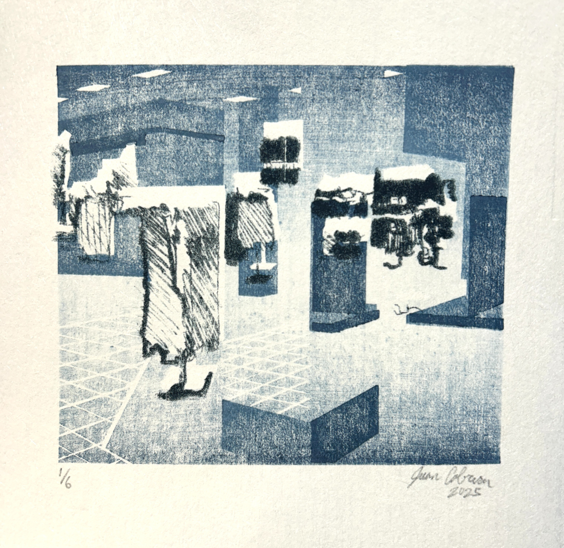 This focus on process is reflected in the work of Juan Cabrera, whose process involves manipulating found photographic source material to create works on paper depicting architectural dream spaces. Through his practice in watercolor and woodblock printmaking, he investigates emotional attachment to architectural interior space, layering disparate textures and images to reveal hidden tensions.